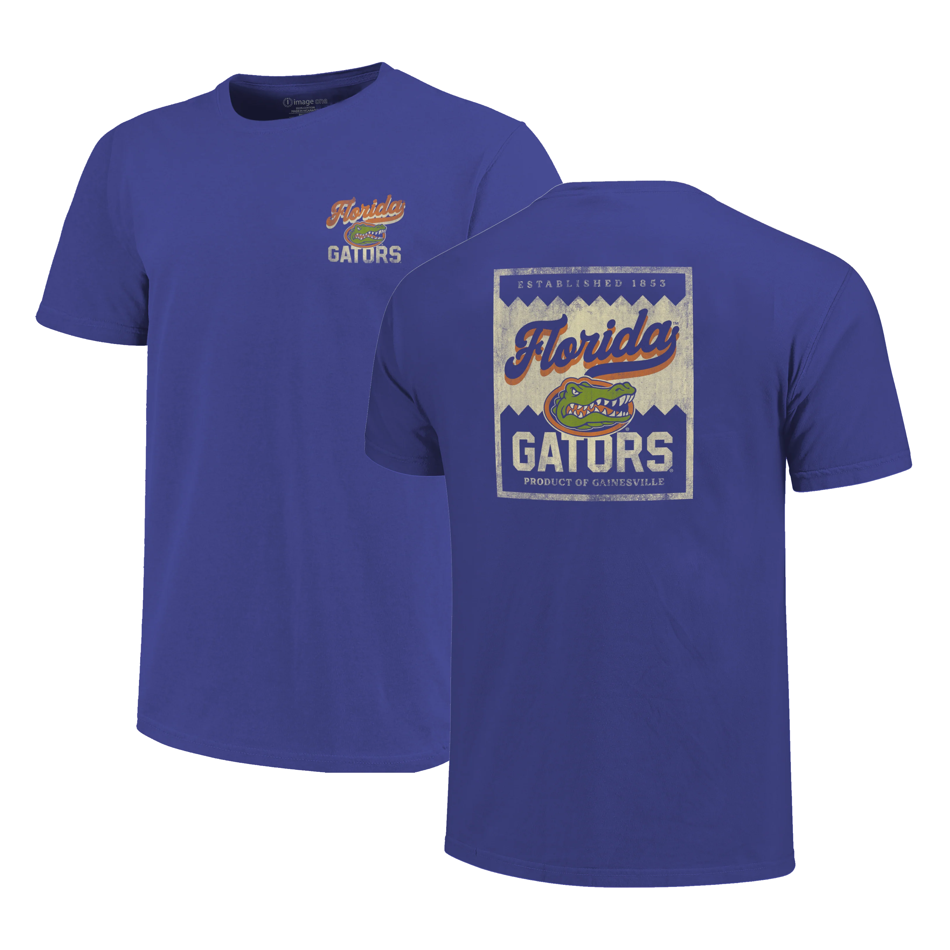 A distressed blue unisex 100% cotton tee with a vintage looking graphic on back and front left chest.